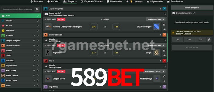 O 589Bet oferece uma grande seleção de opções de apostas em e-sports com probabilidades competitivas